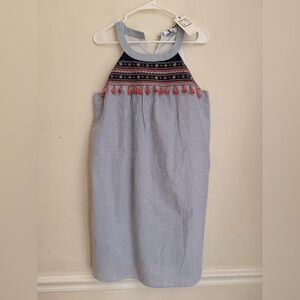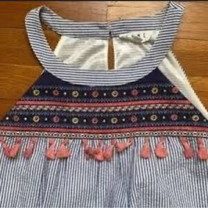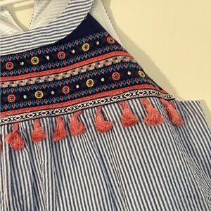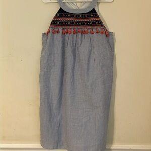 Stylish halter dress with embroidered details. Features blue and pink accents. Perfect for casual outings.