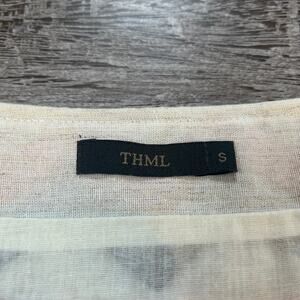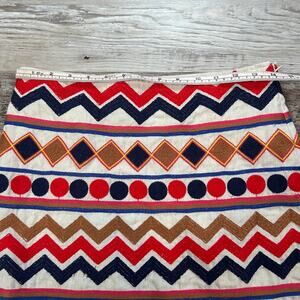 THML embroidered mini skirt featuring bold geometric and chevron patterns in red, navy, mustard, and tan on a natural linen-look base. Fully lined with a hidden side zipper. Vintage-inspired design with a modern boutique twist. Great condition with no flaws.