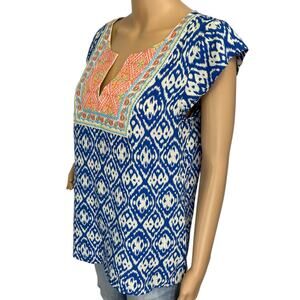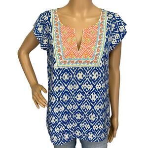 THML Embroidered Top Blue Orange Short Sleeve Boho Size M
