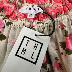 Charming floral blouse by THML. Features pink flowers on a cream background. Ruffled sleeves and neckline add elegance.