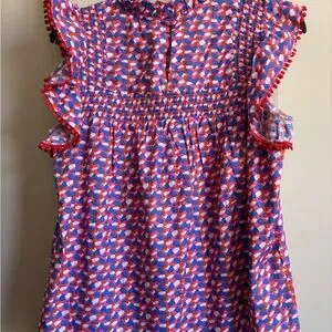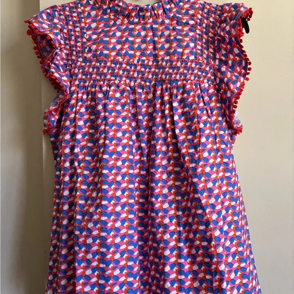 Vibrant THML top with geometric design. Features shades of blue, pink, and red. Ruffled sleeves with pom-pom trim.