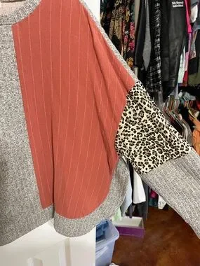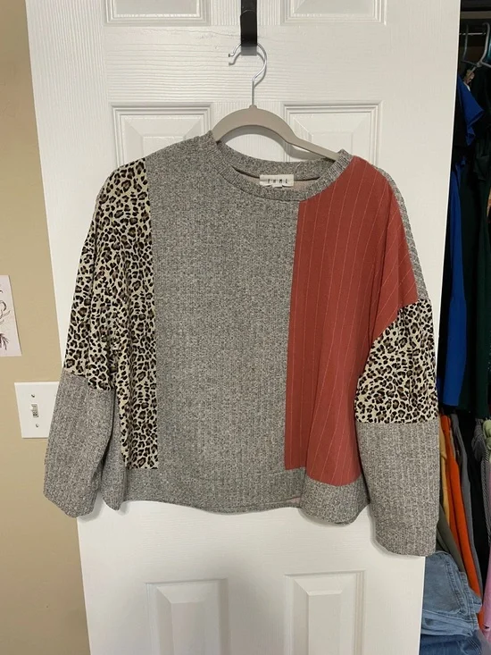 THML knit sweatshirt with ribbed gray center. Rust-colored side panel adds warmth. Lightweight casual layering piece. Simple, versatile design. More of a cropped sweater
