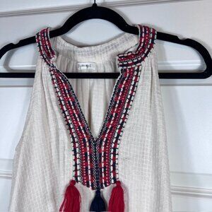 Fun and effortlessly stylish, this THML sleeveless mini dress is crafted from 100% cotton with a textured ivory fabric. The standout detail is the bold embroidered neckline in red, navy, and white, finished with playful tassels for a chic boho vibe.