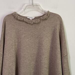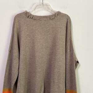 THML Knit Top Sweater M Fringe Trim Tan Pullover Boat Neck Rainbow Stripe Cuff