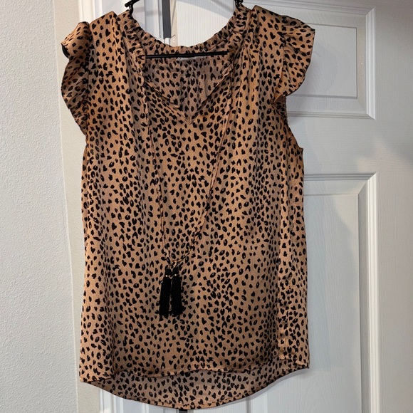 THML size medium in great condition. Stylish animal print blouse with ruffle sleeves. Perfect for casual outings.