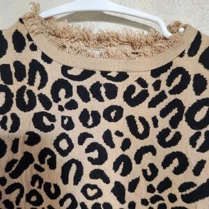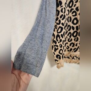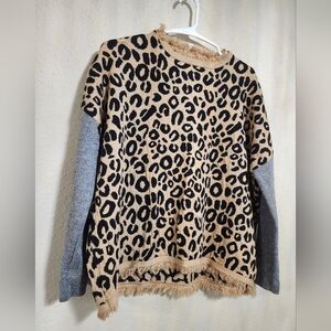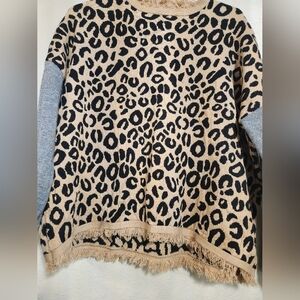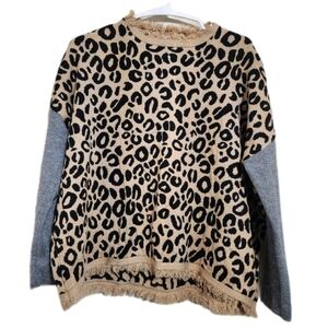 The THML Women's Leopard Print Sweater with Gray Contrast Sleeves and Fringe is a stylish and trendy pullover sweater designed for women in size XS. The multicolor leopard print exterior with gray contrast sleeves and fringe accents adds a touch of edge and sophistication to the garment. This sweater is perfect for those looking to make a statement with their outfit while staying warm and cozy. With its unique design and attention to detail, this THML sweater is a standout piece for any wardrobe. excellent condition