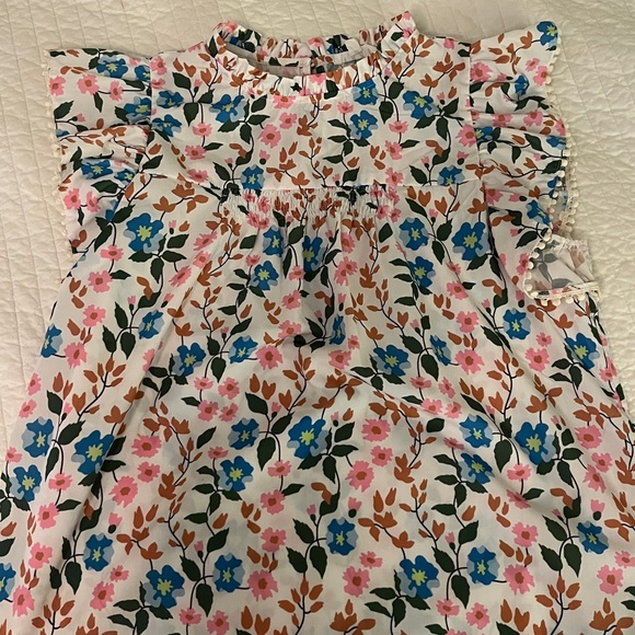 Elegant dress with floral design. Features ruffle sleeves. Multicolor pattern includes pink, blue, and brown.
