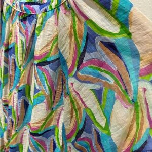 Bright top with multicolor leaf design. Includes blue, green, and pink hues. Crafted by THML.
