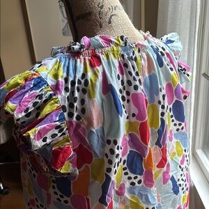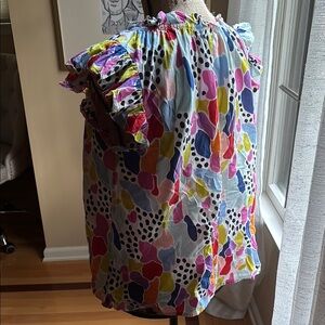 Vibrant top with ruffle sleeves. Features abstract multicolor pattern. Lightweight and stylish.