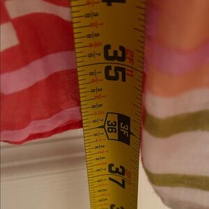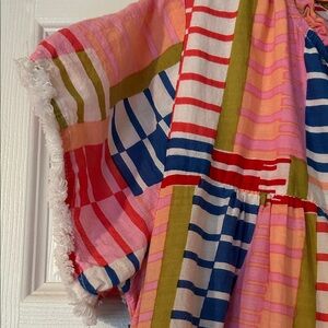 Charming top with ruffled neckline. Features multicolor stripes for a lively look.