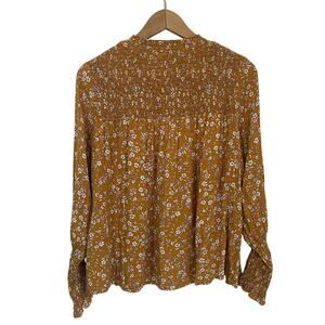 THML Mustard Smocked Floral Blouse Ruffle Sleeve Boho Chic Top Size Medium
