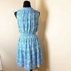 This delightful dress is adorned with a charming blue and white ethnic print, giving it a lively, bohemian flair. The design features a sleeveless cut and a keyhole neckline adorned with playful tassel ties in bright pink and orange, adding a fun pop of color. Its elasticized waist cinches softly, enhancing the natural silhouette, while the skirt flares out into a comfortable, airy shape that ends just above the knee, making it perfect for warm weather outings or casual summer events.