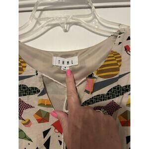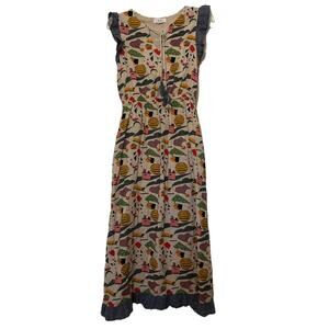 THML Office Print Maxi Rayon Blend Dress Sz Small Lined Tassel Tie Ruffle Sleeve