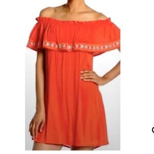 THML Orange Aztec-Inspired Embroidered Off Shoulder Ruffle Mini Dress Sz Medium