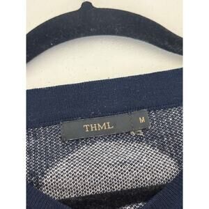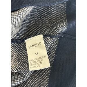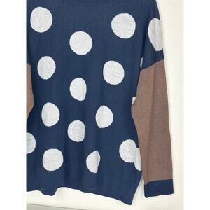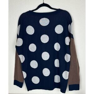 Navy Blue with large gray polka dots, brown sleeves with blue cuffs.