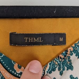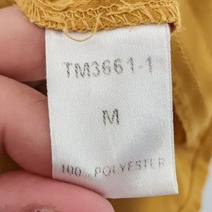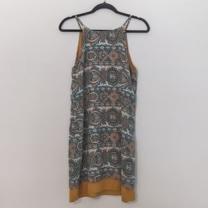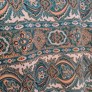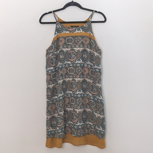 Teal, peach, white and yellow paisley floral pattern summer dress. Double layer with solid mustard yellow base layer. Light chiffon type material. Armpit to armpit is about 18.5 inches. Length is about 36.5 inches. Excellent condition!