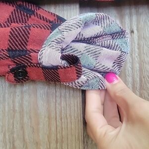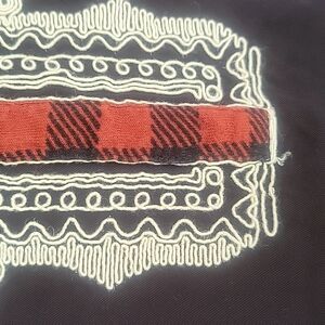 Red and black plaid top with beautiful embroidery along the neckline and button tab sleeves.