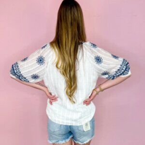 Get ready to set sail in style with the [THML] Yacht Club Chic Embroidered Top! This top features a playful navy embroidered pattern on a slightly sheer, shimmery material that adds a touch of sophistication to any outfit. The v neckline and sheer puff half sleeves provide a flirty and feminine look.