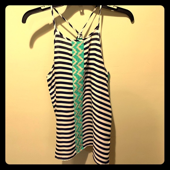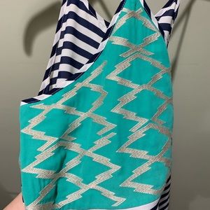 Very unique pattern - white and navy blue stripes with teal and light gold detailing. This is a lightweight breezy top, perfect for summer parties and festivals!