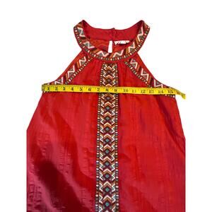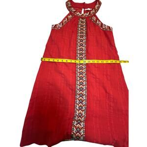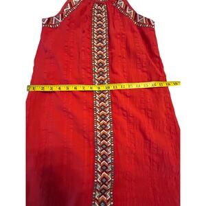 Brighten your wardrobe with this stunning THML embroidered dress, perfect for summer festivals, brunch dates, or casual outings. This vibrant red/orange dress features a flattering halter neckline and eye-catching tribal-inspired embroidery along the front and neckline for a fun, boho-chic vibe. Crafted from 100% cotton for breathable comfort, it’s fully lined for coverage and structure. A button closure at the back of the neck ensures easy wear, while the relaxed shift silhouette flatters every figure. Ideal for warm-weather styling, this piece pairs effortlessly with sandals or wedges. Colors and measurements may vary slightly due to differences in lighting, display settings, or AI-generated rendering.