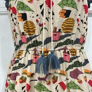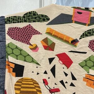 Cream/tan with a multicolored mod office workplace print