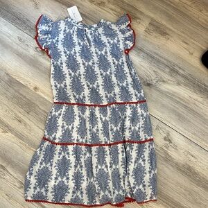 A flowy flattering fit with beautiful ruffle sleeves, a smocked neckline, and button closure at the back of the neck.
