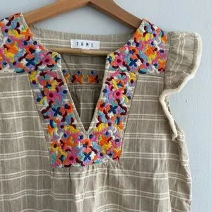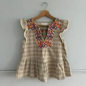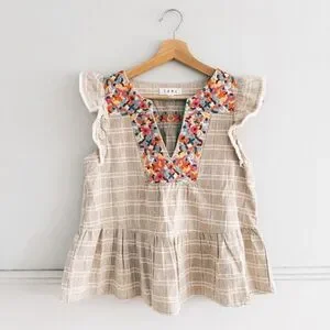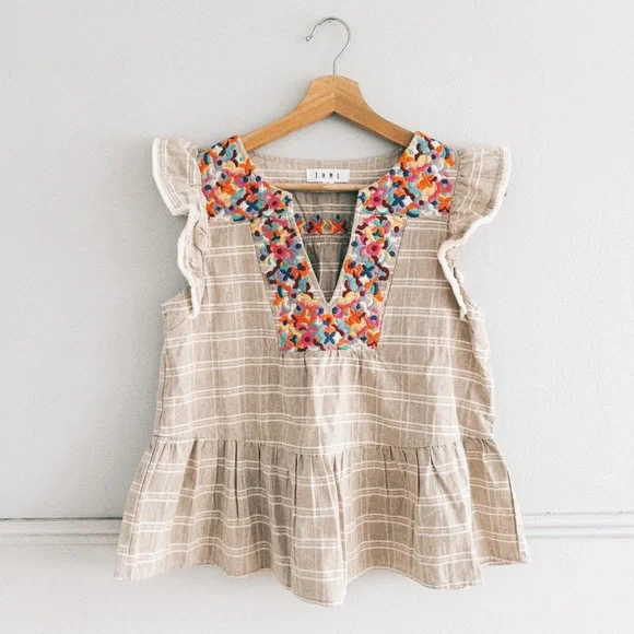 Charming beige and cream plaid ruffle sleeve peplum top with colorful floral embroidery.