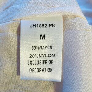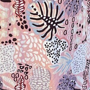 Sleeveless tropical floral/leaf print in a beautiful color palette of pinks, deep purple with burgundy undertones, periwinkle and white. Sleeveless with a cap ruffle sleeve, high ruffled neck, tiered ruffled hem and back keyhole closure. Slight A-line silhouette, fully lined. Casual or semi formal dress, flattering comfortable fit.