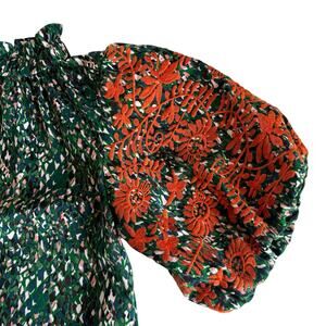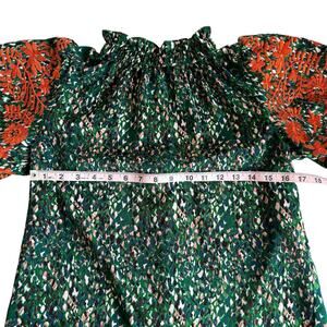 THML Say It All Green Floral Blouse Orange Embroidered Puff Sleeves Size XS