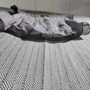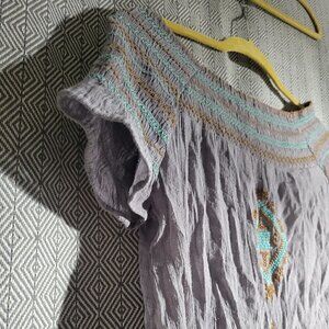THML Scrunch Off The Shoulder Gray With Brown & Teal Embroidery Aztec Design Top