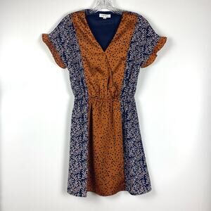 THML Shake It Up womens dress in navy blue and caramel brown. Contrasting navy vine pattern with caramel brown dot pattern. Faux front wrap. Ruffle cap sleeves. Elastic waist. Lined. Size XS. Excellent used condition. No flaws detected. Please check measurements provided for fit.