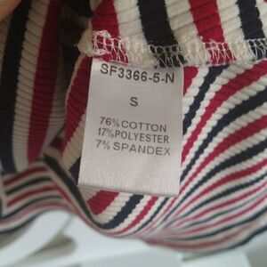 Details: Red, white and blue stripe dress in a sleeveless, fitted silhouette. Zips up the back. Dress up or down.