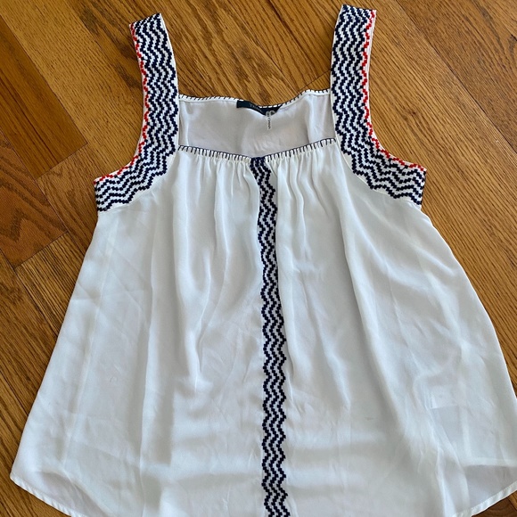 Womens THML patterned sleeveless blouse with navy and red tribal pattern accent. Excellent condition, slightly sheer (works fine with a nude bra), billowy, no underarm gap.