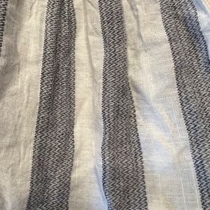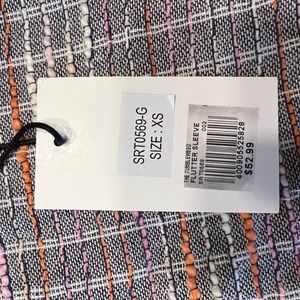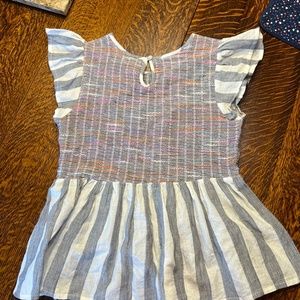 THML boutique brand 100% cotton size XS women's top. Top has a peplum cut and sleeves are flutter. Back has one small button closure at neck. Top is striped navy and white, or could be considered striped grey and white. The weaving on the bodice has these two colors, plus pink and orange. Original price is 52.99. 100% cotton, made in India, gentle cool hand wash and dry flat in shade.