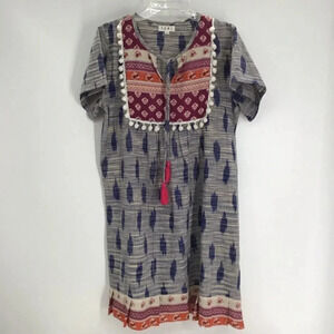 Nice THML V-neck Tunic Boho style summer casual dress. Features v-neck with tie, Pom Pom detail around chest, multi-patterned fabric & lightweight for summer. Made In India