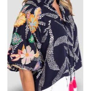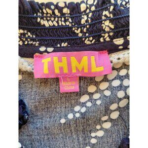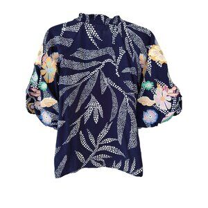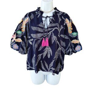 THML Womens Navy Floral & Dot Print Rayon Peasant Blouse With Tassel Tie Neck