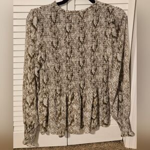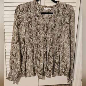 Stunning snake print blouse by boutique brand THML. Features smocked bodice, v-neckline, and flowy peplum hem. Great for work or weekend wear. NWOT
