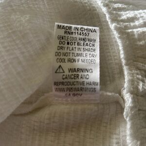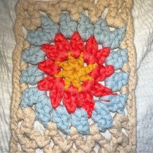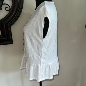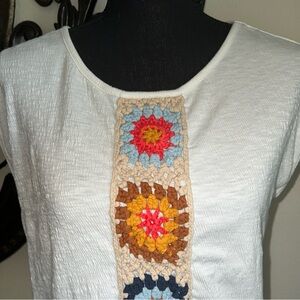 THML women’s pullover, white crinkled fabric with a peplum hem and a vertical panel of four crochet granny squares down the center front. The granny squares are different colors, with the top one being pink, blue, and yellow, followed by orange, brown, and yellow, then navy blue, light blue, and brown, and finally brown, light blue, and yellow. The top has short, cap sleeves and a round neckline. No holes or stains.