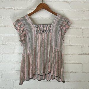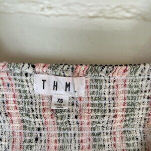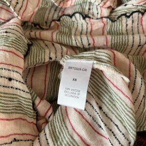THML women’s embroidered blouse in an XS. The top would also fit a small. It is in good condition. There is black embroidery details down the front. The top has a soft cotton, breathable feel to it. Flowing boho style, similar to Free People.