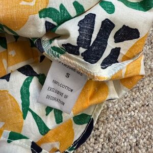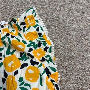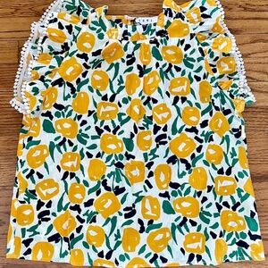 Top is made of golden yellow, green, black and white floral print fabric and has ruffle sleeves with white ric-rac sewn on the hem of the sleeves. Top is brand new without tags…never worn