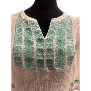 White gauze like tunic top 3/4 sleeve embroidered detail on front and around arms and bottom side slits. Great condition!