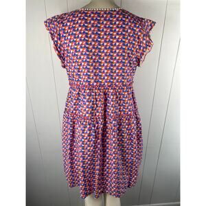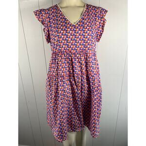 THML brand dress with a geometric print. It features a v-neck with white trim, flutter sleeves, and a tiered skirt with ruffled details. Excellent condition size medium.