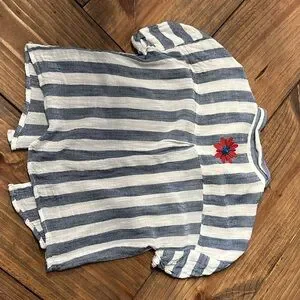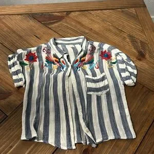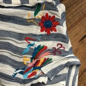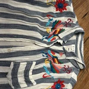 Super cute striped top with amazing colorful detail! Buttons down the front, cuffed sleeves, cute front pocket!