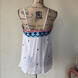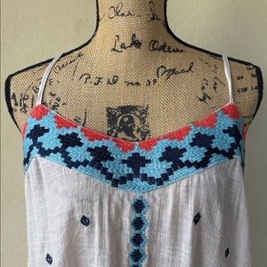 Light weight, spaghetti strap, flowy top made by THML. Has beautiful, Aztec-like embroidery detailing around neck and backline, down front mid center, and also on the entire bodice. Straps are adjustable, fabric is semi sheer. Excellent condition!