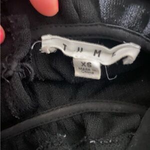 Thicker knit material, ruffled sleeves at shoulders; loose fitting; button closure at back; never worn because sleeved didn’t look good on me