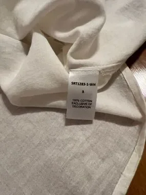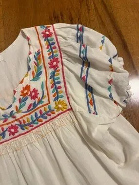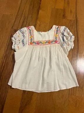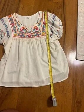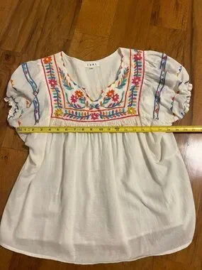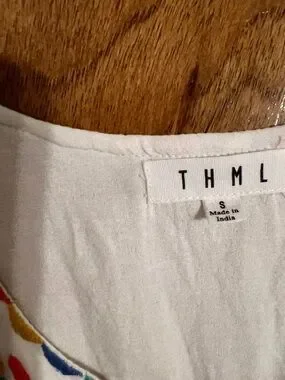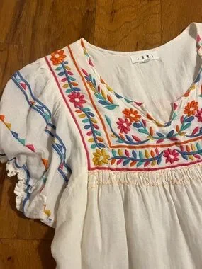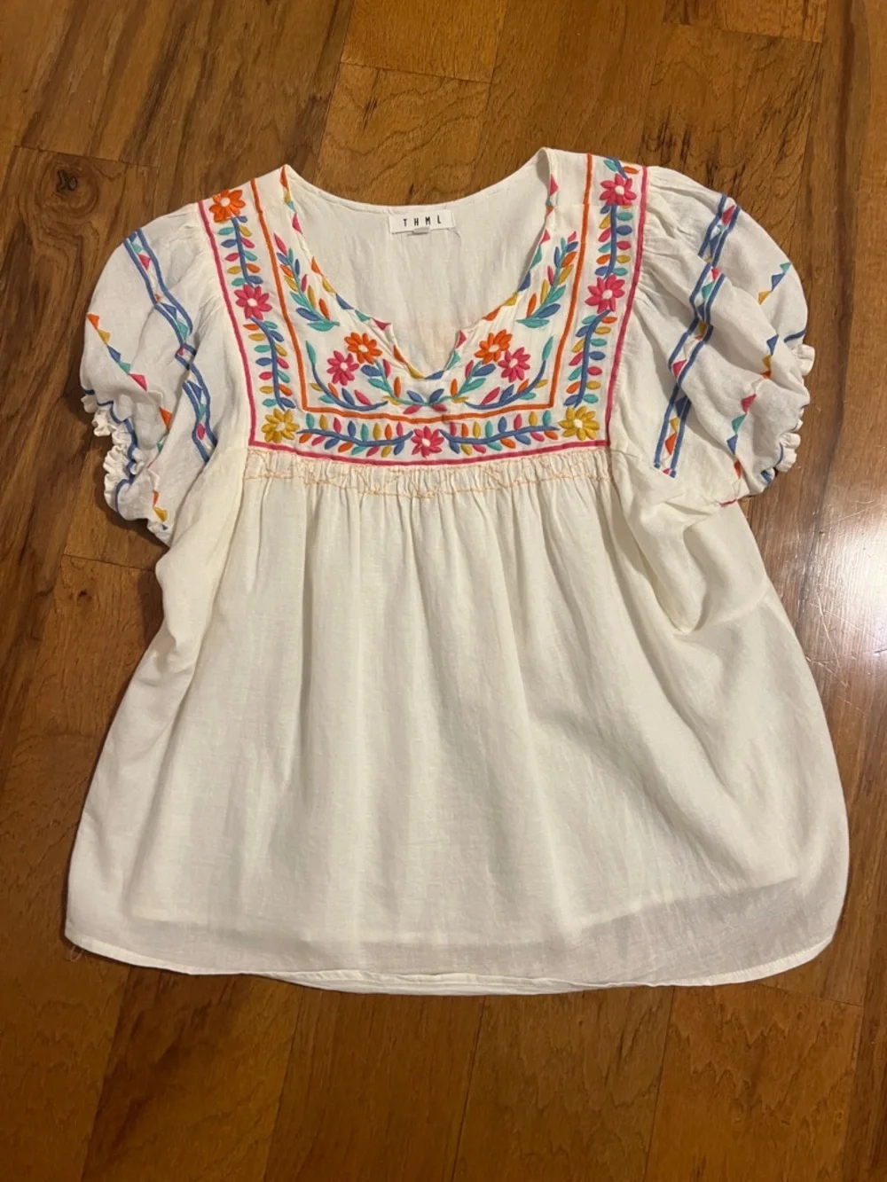 THML white blouse featuring colorful floral embroidery around the neckline and sleeves