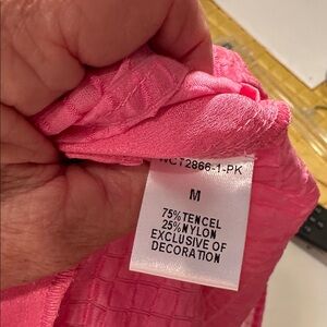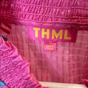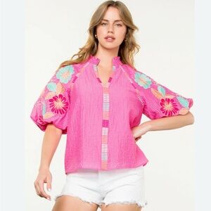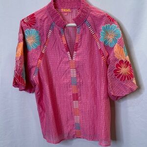 THML top in silky bright pink. Embroidery on sleeves and down front. Sz M. NWOT