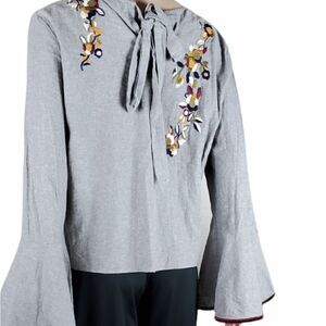 THML Anthropolgie Gray Embroidery Blouse with Bell Sleeves, has velvet trim on sleeves, pretty tie at the neck