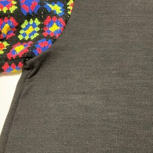 THML, an Anthro Brand, James Crochet Puff Sleeve Knit Sweater! Multicolor Afghan square puff short sleeves dress up a fitted black knit bodice. Keyhole button closure at nape. A very slight run in front- hardly noticeable. Does not deter from its beauty! Flat lay 26” L 18” P-P. #grandmacore #anthro #puffsleeve