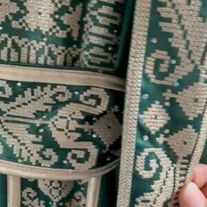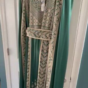 beautiful silk green thobe with gold tatreez and back cape/tassles. never worn. Was custom made for a wedding and did not end up attending